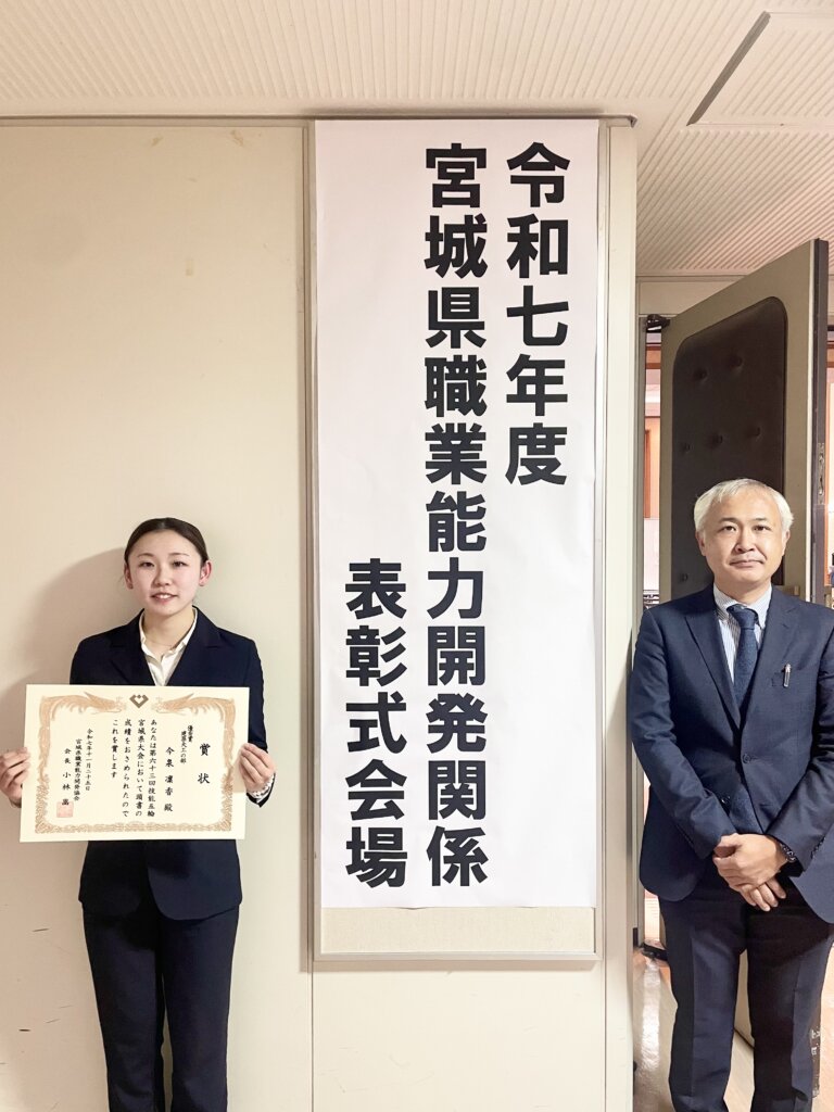 令和6年9月に開催された第63回技能五輪宮城地方大会の表彰式が、宮城県庁にて開催され、大工技能学科を令和7年3月に卒業した今泉凜香さんが「優秀賞」を受賞しました。本校が技能五輪で表彰されるのは、今回が初めてとなります。