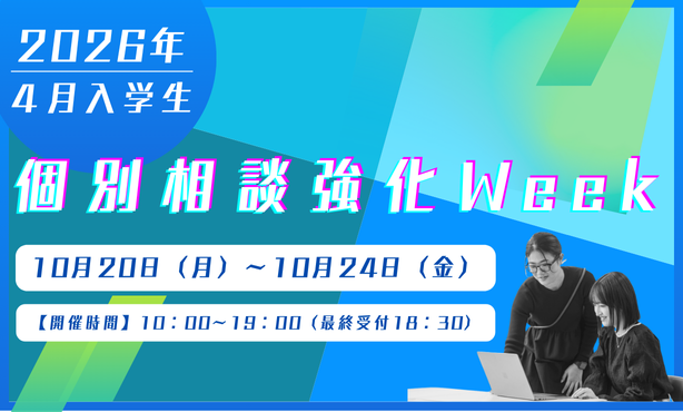 オープンキャンパスへの参加が難しい方や進路変更の検討など、個別でじっくり相談がしたい方向けに、下記の期間を「個別相談強化ウィーク」と称し、スタッフを増員して対応できるようにいたします!