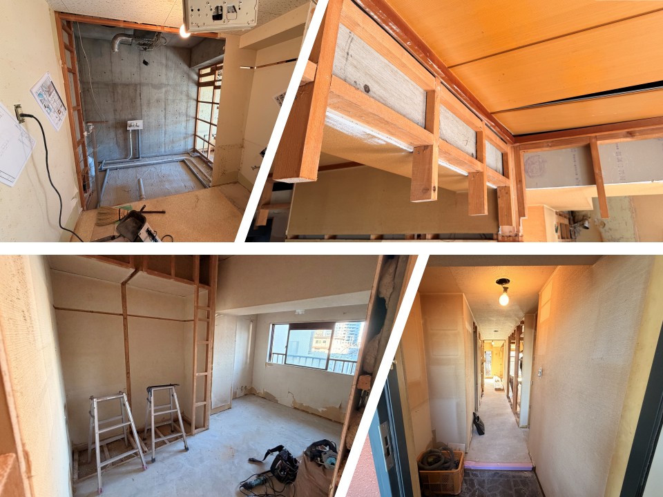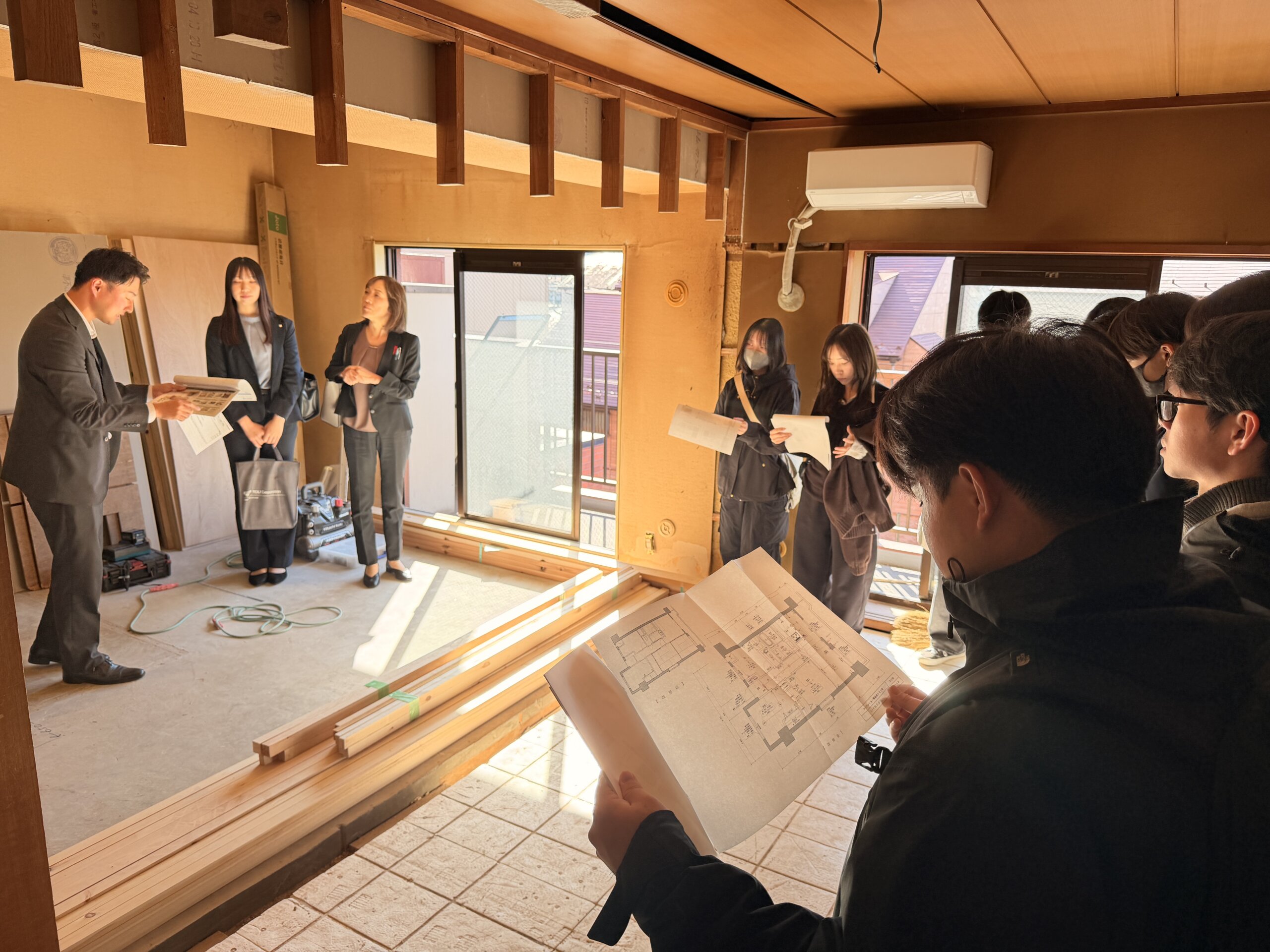 今回はカメイ株式会社様のご協力のもと、マンションの一室をリフォームしている現場にお邪魔し、解体中の現場見学と施工についてのご説明をいただきました。