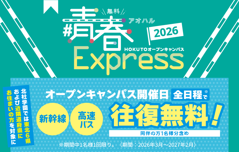 オープンキャンパス全日程で新幹線・高速バスが往復無料で利用できるため、自分の予定に合わせて申込可能!参加したい日程を申し込めば、乗車予定日の2日前までにご自宅に乗車チケットをお届けします!